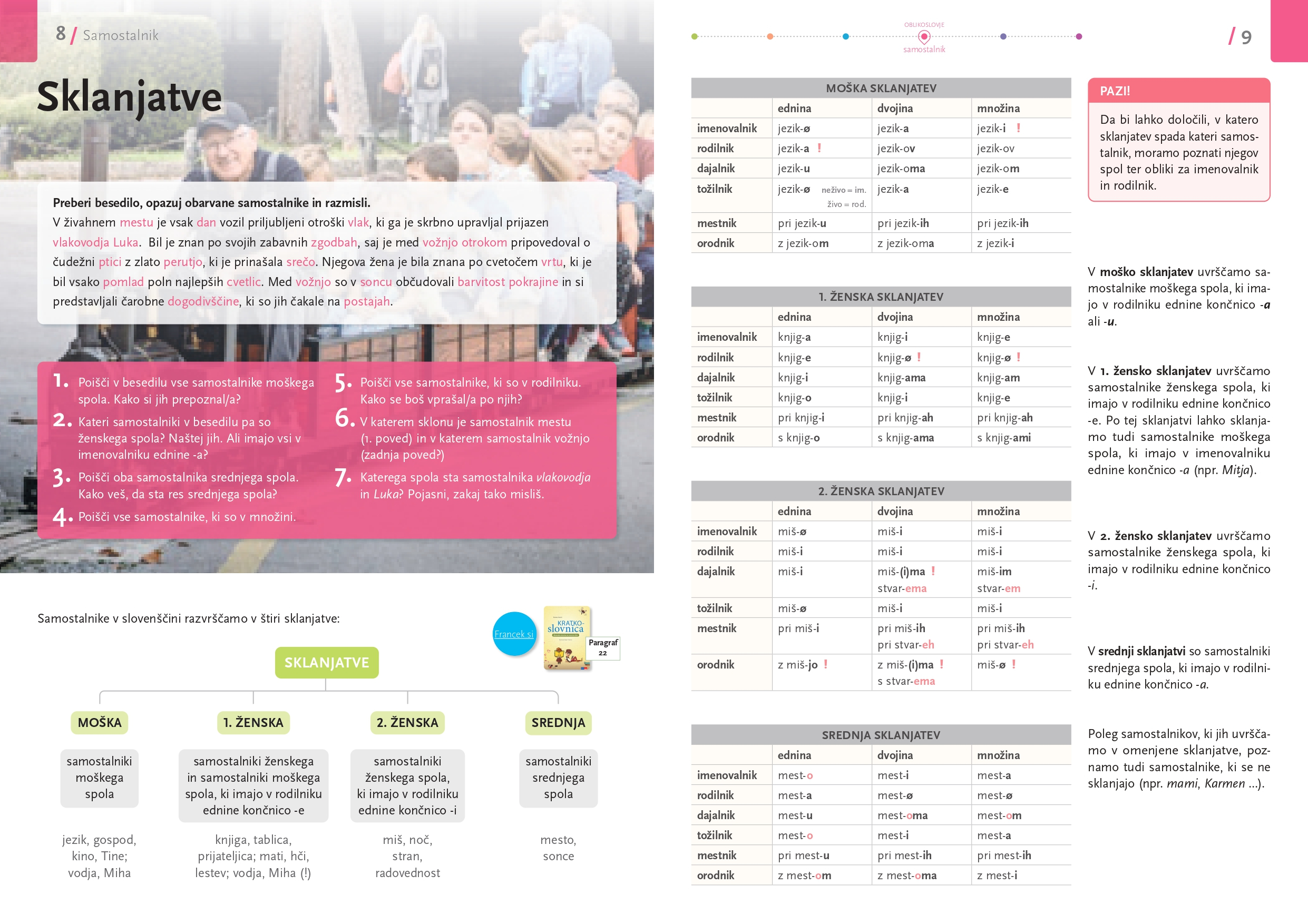 Učbenik in delovni učbenik Slovenščina 7: Skrivnost jezika sta prenovljeni učni gradivi za 7. razred, zasnovani po prenovljenem učnem načrtu. Poudarjata praktično rabo jezika, branje neumetnostnih besedil, digitalno pismenost ter aktivno učenje. Slovnica je predstavljena pregledno in sistematično, brez učenja definicij – učenci znanje usvajajo predvsem z nalogami, preglednicami in jasnimi prikazi.